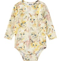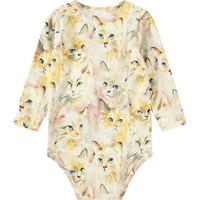 Lys langærmet body i økologisk bomuld. Bodyen har trykknap i kraven og mellem benene, hvilket gør det nemt at tage den af og på. Den har et alloverprint af søde akvarel malet katte i grå, gule og lyse nuancer. Kombiner bodyen med matchende leggings for at fuldende looket.