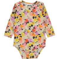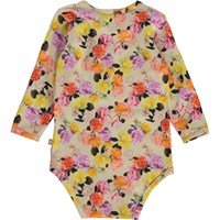 Foss er en gul babybody med lange ærmer, fremstillet i 100% økologisk bomuldsjersey. Foss har trykknap i kraven og mellem benene, som gør det nemt at få bodyen af og på. Bodyen er i allover printet, Baby Roses, der tager dig med igennem havens roser i alverdens farver.