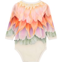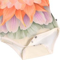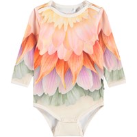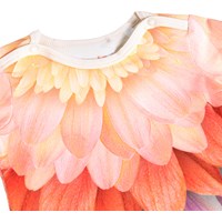 Langærmet body i orange nuancer med blomsterprint, til de mindste. Fremstillet i økologisk bomuld. Har kantbånd samt knaplukning på skuldrene og mellem benene for nem af- og påklædning.