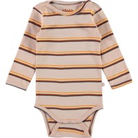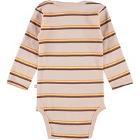 Foss er en langærmet baby body i lyserød med smalle striber på tværs i brun og gul. Trykknapper ved hals og mellem ben, gør det let at få bodyen af og på.