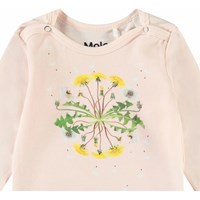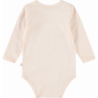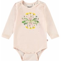 Lys langærmet body i økologisk bomuld til de mindste. Bodyen har kantbånd samt knaplukning på skuldrene og mellem benene for nem af- og påklædning. Denne body har print af mælkebøtter på brystet.