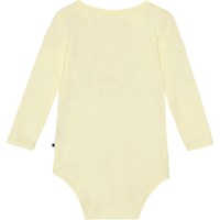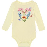 Gul babybody med lange ærmer, i økologisk bomuldsjersey. Bodyen har trykknap på hver side af skulderen og mellem benene, som gør det nemt at få den af og på. Bodyen har et frontprint af et hjerte formet af farverige blomster og sommerfugle.