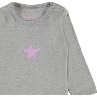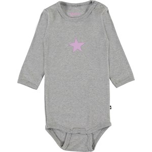 Foss er en langærmet baby body i grå med stjerne på fronten. Trykknapper ved hals og mellem ben, gør det let at få bodyen af og på.