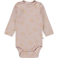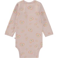 Lyserød babybody med print af smilende hjerter i forskellige farver. Denne body er fremstillet i 100% bomuld, har lange ærmer, samt trykknapper i kraven og mellem benene, som gør det nemt at få bodyen af og på. Match evt. denne body med bukserne, Seb, i samme print.