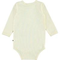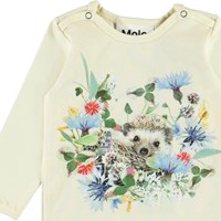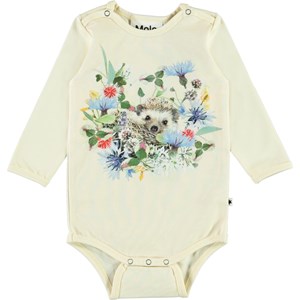 Foss er en langærmet baby body med print af et baby pindsvin på fronten sammen med vilde blomster. Trykknapper ved hals og mellem ben, gør det let at få bodyen af og på.