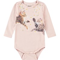 Råhvid langærmet body i økologisk bomuld. Bodyen har trykknap i kraven og mellem benene, hvilket gør den nem at tage af og på. Den har et print af farverige sommerfugle, der flyver på en grøn baggrund.
