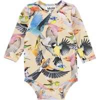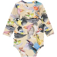 Foss er en lysegul babybody med print af forskellige fugle. Foss har trykknap i kraven og mellem benene, som gør det nemt at få bodyen af og på.