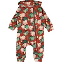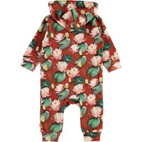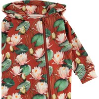 Fowo er en baby heldragt med print af lyserøde åkander. Fowo har hætte og skrå lynlås lukning på fronten.