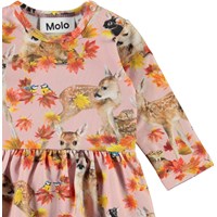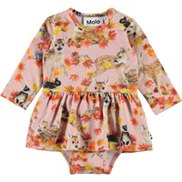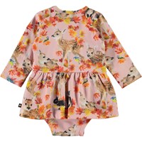 Frances er en langærmet baby body i lyserød med print af rådyr og kaniner, samt gyldne blade. Frances har peplum skørt og trykknapper på den ene skulder og mellem benene på bodyen, som gør det nem at få den af og på.