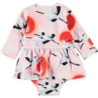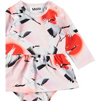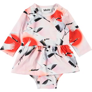 Frances er en langærmet baby body i lyserød med print af flyvende traner. Frances har peplum skørt og trykknapper på den ene skulder og mellem benene på bodyen, som gør det nem at få den af og på.