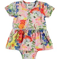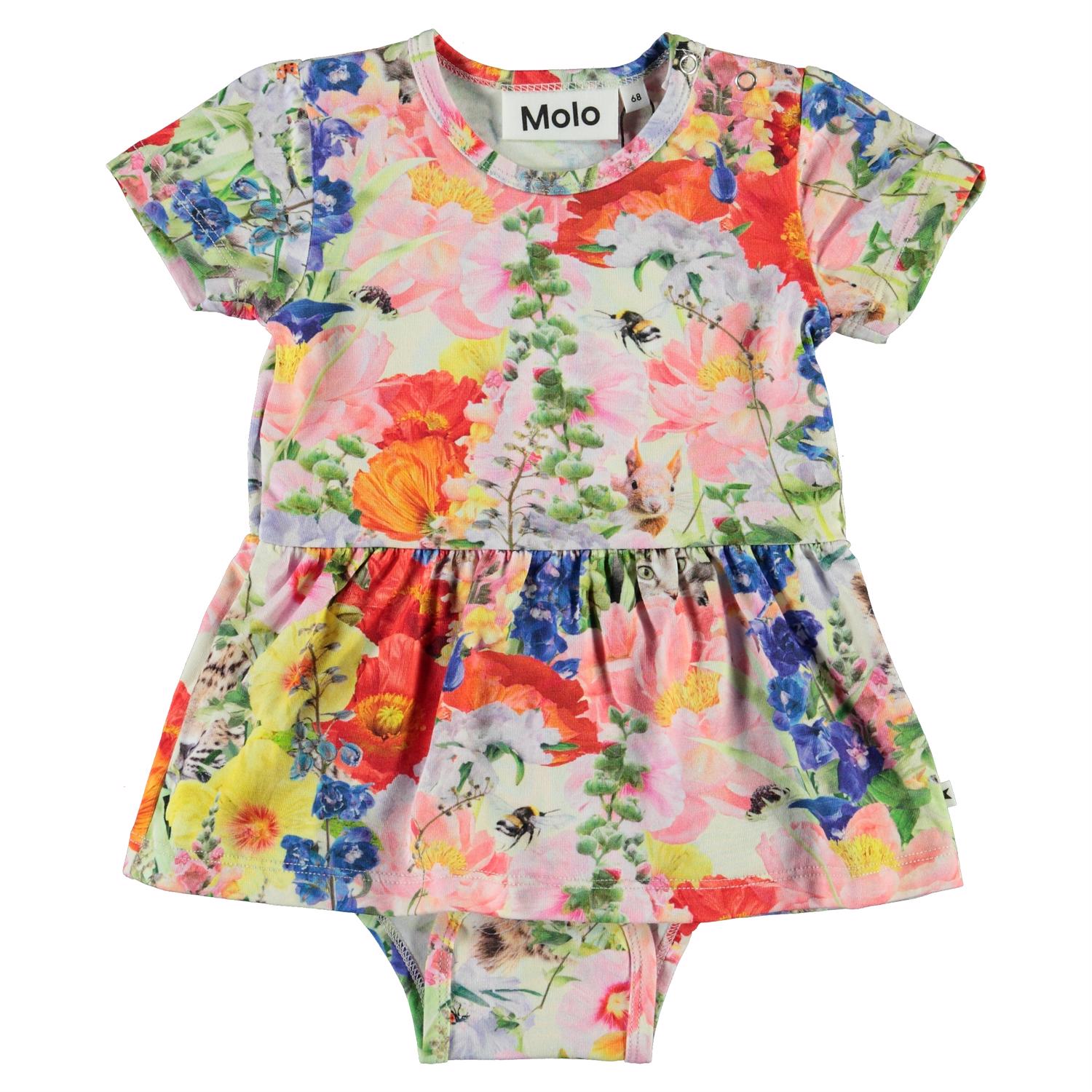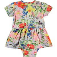 Frannie er en baby body med blomster print, som gemmer på forskellige dyr mellem blomsterne. Frannie har korte ærmer, peplum skørt og trykknapper på den ene skulder og mellem benene, som gør det let at få bodyen af og på. Certificeret af Ecocert Greenlife, certifikationsnr. 197496.