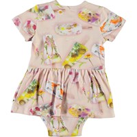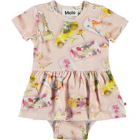 Frannie er en lyserrød baby body med print af is. Molo har selv frosset disse flotte blomster is, som er blevet til dette print. Frannie har korte ærmer, peplum skørt og trykknapper på den ene skulder og mellem benene, som gør det let at få bodyen af og på. Certificeret af Ecocert Greenlife, certifikationsnr. 197496.