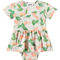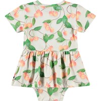 Lys body i økologisk bomuldsjersey til de mindste. Bodyen har rund hals, korte ærmer, peplumskørt samt knaplukning ved skulderen og mellem benene, hvilket gør det let at få bodyen af og på. Denne body har print af kirsebær.