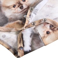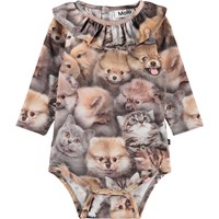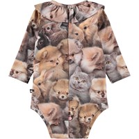 Body i økologisk bomuld til de mindste med print af fluffy dyr. Bodyen har lange ærmer med flæsekant rundt om halsen og kantbånd. Knaplukningen i ryggen og mellem benene gør den nem at få af og på.