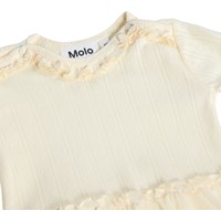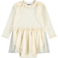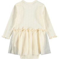Langærmet body i hvid bomulds-pointelle til de mindste. Detaljeret med babylock-kanter, flæse ved halsen og et let påsyet skørt. Lukkes praktisk med knapper på skuldrene og mellem benene for nem af- og påklædning.