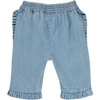 Sallie er et par lyseblå denim babybukser. Bukserne har fine flæsekanter, samt en elastisk talje.