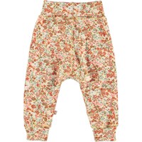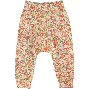 San er et par bløde babybukser med fint blomsterprint. Bukserne har en bred elastisk talje og benafslutning, hvor begge dele er ombukket. Kombiner med matchende overdel.