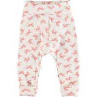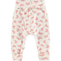 San er et par bløde hvide babybukser med rosa hesteprint. Bukserne har en bred elastisk talje og benafslutning, hvor begge dele er ombukket. Kombiner med matchende overdel. Certificeret af Ecocert Greenlife, certifikationsnummer 197496.