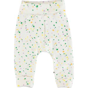 San er et par bløde hvide babybukser med farverigt stjerneprint. Bukserne har en bred elastisk talje og benafslutning, hvor begge dele er ombukket. Kombiner med matchende overdel.
