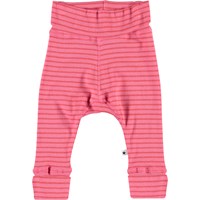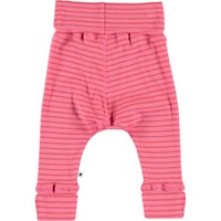 Sara et et par baby bukser i pink og rød stribet rib. Bukserne har bred elastisk talje, samt ombuk ved benene. Kombiner bukserne med matchende bluse.