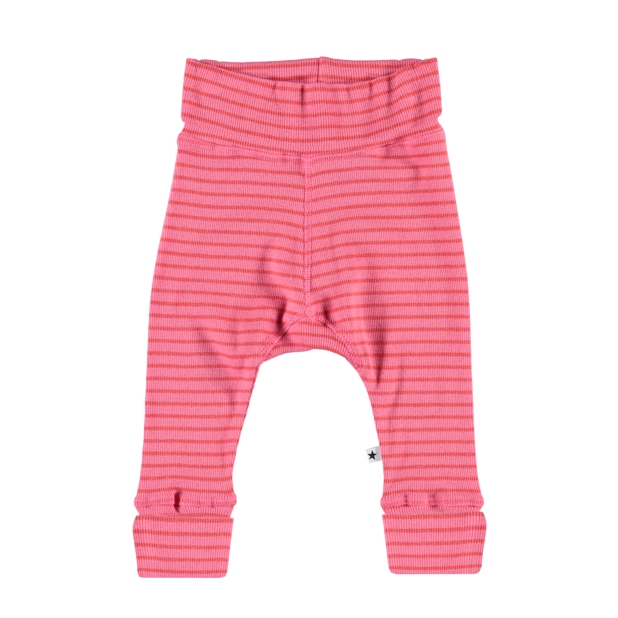 Sara et et par baby bukser i pink og rød stribet rib. Bukserne har bred elastisk talje, samt ombuk ved benene. Kombiner bukserne med matchende bluse.