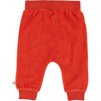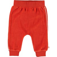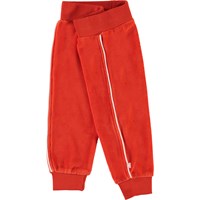 Shona er et par baby sweatpants i rød velour med hvide pipings i siderne. Bukserne har en elastisk talje og benafslutning.