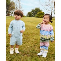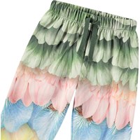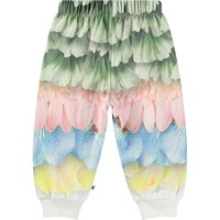 Bløde bukser i økologisk bomuld til de mindste. Bukserne har elastik og bindebånd i taljen samt ribkanter ved benene. De er nemme at tage af og på og har masser af plads til bevægelse.  Denne style har en ubørstet inderside, hvilket betyder, at den er dejlig kølig på en varm dag. Bukserne er multifarvede med print af fjer og blomsterblade. Kombinér med matchende sweatshirt for et komplet outfit.