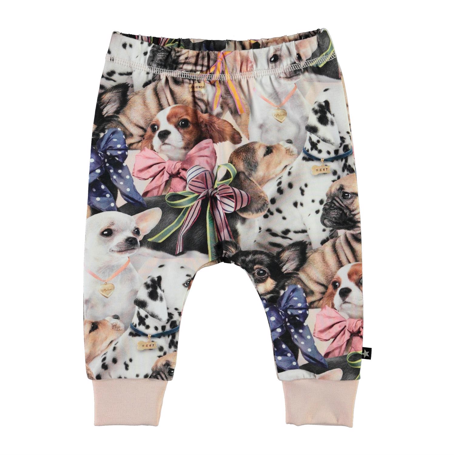 Simone er et par baby bukser med print af små hunde med sjøjfer om halsen. Bukserne har elastik i taljen samt brede grå, elastiske kanter ved anklerne. Certificeret af Ecocert Greenlife, certifikationsnr. 197496.