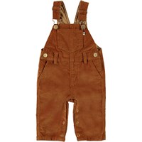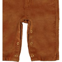 Sky er et par baby smækbukser i brun velour. Bukserne har justerbare seler, knapper i siden, samt mellem benene.