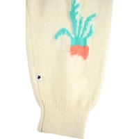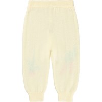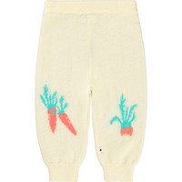 Lysegule bukser til de mindste i en blød strik med gulerødder på knæene. Bukserne har elastik i taljen, som gør dem nemme at tage af og på, samt ribkanter ved anklerne. Kombiner med matchende bluse for et komplet sæt.