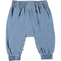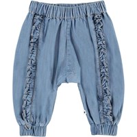 Sophia er et par lyseblå denim babybukser med en rummelig pasform og flæsekanter på fronten. Bukserne har en elastisk talje, som sikrer at bukserne sidder godt.