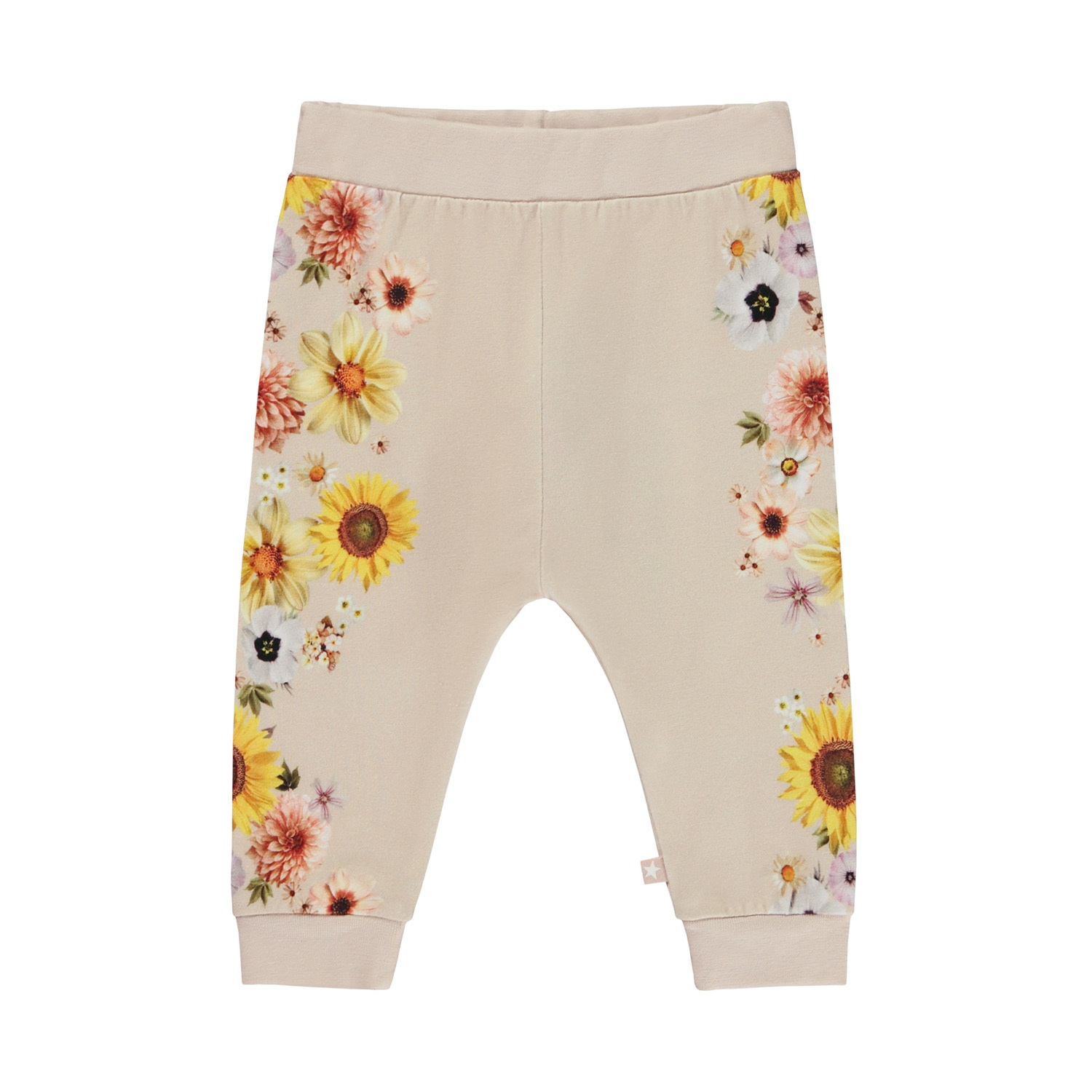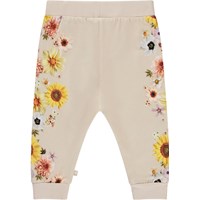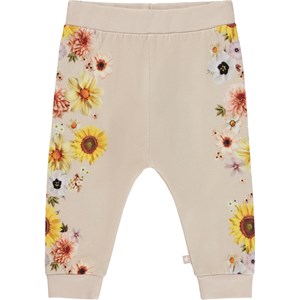 Lyserøde babybukser med placement print af farverige blomster på siden af benene. Bukserne har elastisk talje og benafslutning.