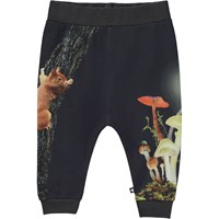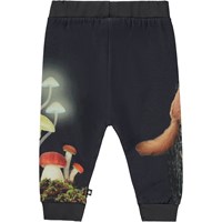 Mørkeblå babybukser med print af et egern på det ene bukseben og farverige svampe på det andet. Bukserne har elastisk talje og benafslutning.