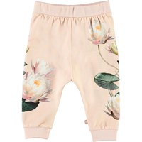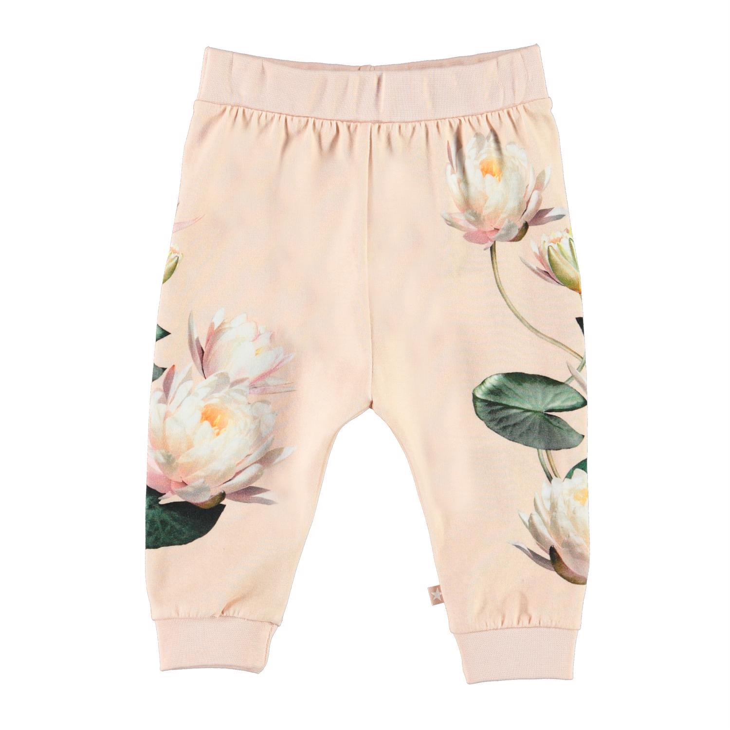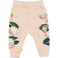 Susanne er et par rummelige lyserøde baby bukser med print af føl og åkander på siden af benene. Susanne har en eleastisk talje og rib ved benafslutning, som sikrer et behageligt fit.