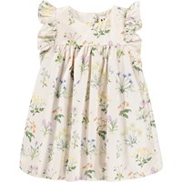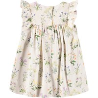 Hvid poplinkjole med blomsterprint i økologisk bomuld til de mindste. Kjolen har små flæseærmer, bærestykke og knaplukning i ryggen for nem af- og påklædning.