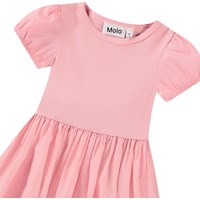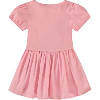 Lyserød kjole i økologisk bomuld til de mindste. Kjolens top er med stretch, som sikrer god bevægelighed. Kjolen har en rund halsudskæring, korte pufærmer med elastik og et rundt skørt. Ærmer og skørt er i poplin.