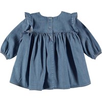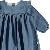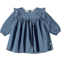 Callie er en fin babykjole i blå denim. Kjolen har lange ærmer og flæsekanter på fronten, samt trykknapper i nakken. Callie er lavet af 100% økologisk bomuld.