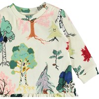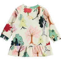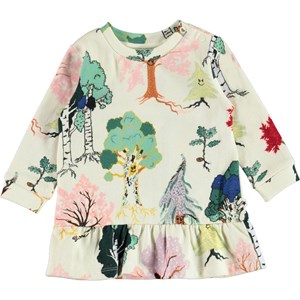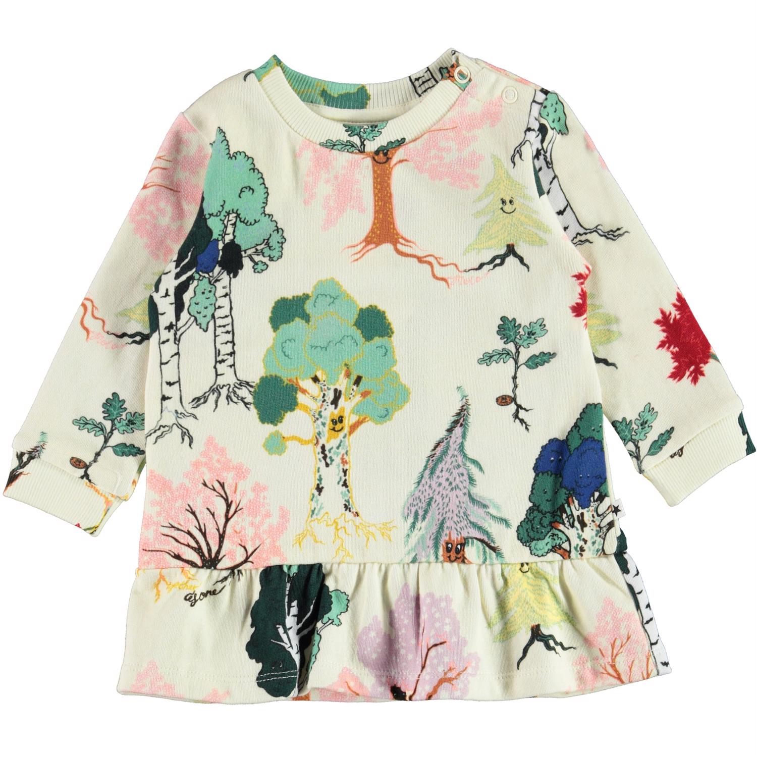 Calypso er en baby sweat kjole med lille skørt for neden og trykknapper på den ene skulder. Kjolen er med print af farverige og glade træer.