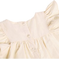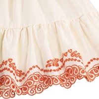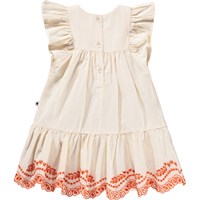 Hvid kjole til de mindste i økologisk bomuld med fine orange broderidetaljer. Kjolen har flæseærmer, dekorativt broderi og knaplukning i ryggen for nem af- og påklædning.