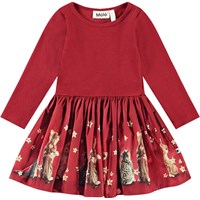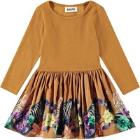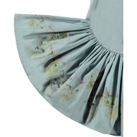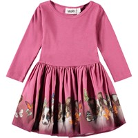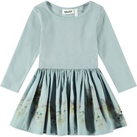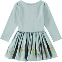 Blå langærmet kjole til de mindste i økologisk bomuld. Toppen er tætsiddende i en ribbet jersey, mens skørtet er i en poplin, der giver kjolen volume. Den er nem at komme i og behagelig at have på. Kjolens skørt har et print af søde katte, der smelter ind i den blå farve.