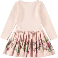 Beige langærmet kjole til de mindste i økologisk bomuld. Toppen er tætsiddende i en ribbet jersey, mens skørtet er i en poplin, der giver kjolen volume. Den er nem at komme i og behagelig at have på. Kjolens skørt har et print af blomster.
