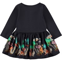 Mørkeblå langærmet babykjole fremstillet i 100% økologisk bomuld. Overdelen af kjolen er i ribjersey, mens det påsyede skørt er i poplin og med print af selvlysende svampe.