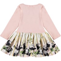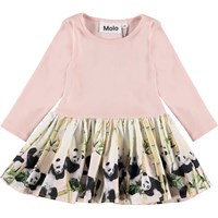 Candi er en baby kjole i to delt look med lange ærmer. Overdelen er i lyserød rib, mens skørtet er med print af pandaer og deres livret bambussen.