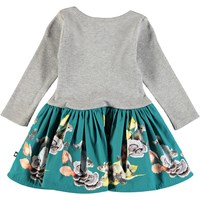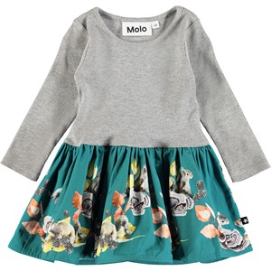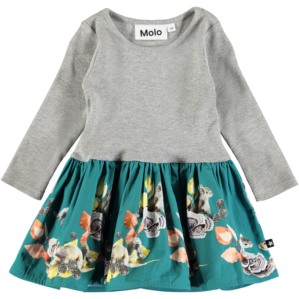 Sød baby kjole i todelt look med en overdel i grå rib og et grønt skørt med digitalprintede egern.