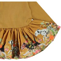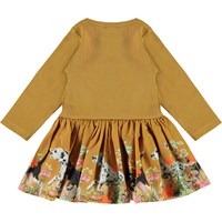 Candi er en sennepsgul baby kjole. Kjolens overdel er i rib med lange ærmer, mens skørtet er med print af hunde som løber imellem blomster. Certificeret af Ecocert Greenlife, certifikationsnr. 197496.