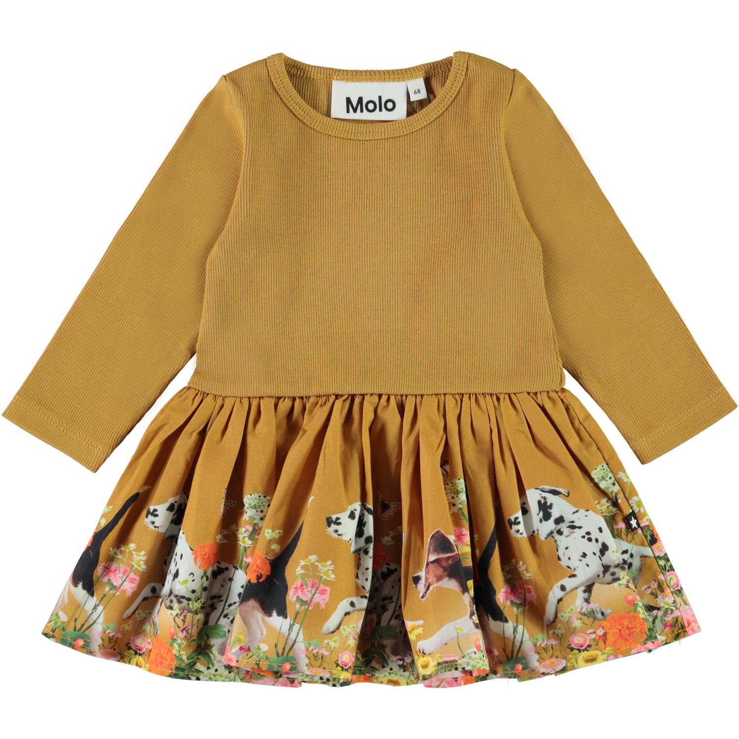 Candi er en sennepsgul baby kjole. Kjolens overdel er i rib med lange ærmer, mens skørtet er med print af hunde som løber imellem blomster. Certificeret af Ecocert Greenlife, certifikationsnr. 197496.