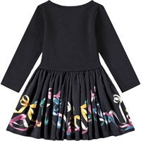 Langærmet kjole til de mindste i økologisk bomuld. Kjolen er sort med fint print af farverige bånd. Toppen er tætsiddende i ribbet jersey, mens skørtet er i poplin, der giver kjolen volumen. Den er nem at tage på og behagelig at have på.