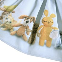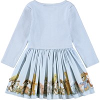Langærmet kjole til de mindste i økologisk bomuld. Kjolen er lyseblå med fint print af hæklede bamser. Toppen er tætsiddende i ribbet jersey, mens skørtet er i poplin, der giver kjolen volumen. Den er nem at tage på og behagelig at have på.