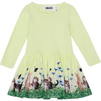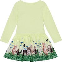 Pastel gul langærmet kjole i økologisk bomuld. Toppen er i ensfarvet rib, mens det rundskåret skørte har et farverigt print af legende kattekillinger.