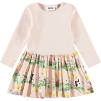 Langærmet kjole til de mindste i økologisk bomuld. Kjolen er lyserød med print af kaniner og mælkebøtter på skørtet. Toppen er tætsiddende i ribbet jersey og har en rund hals med en knap på skulderen, hvilket gør den nem at tage af og på. Påsyet skørt med fin volumen.